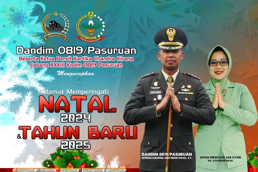 Komandan Kodim 0819/Pasuruan, Letkol Arh Noor Iskak, S.T., bersama Ketua Persit Kartika Chandra Kirana (KCK) Cabang XXXIII Kodim 0819 Pasuruan, beserta staf dan jajaran, mengucapkan selamat Natal 2024 dan Tahun Baru 2025 kepada seluruh masyarakat Kabupaten Pasuruan.