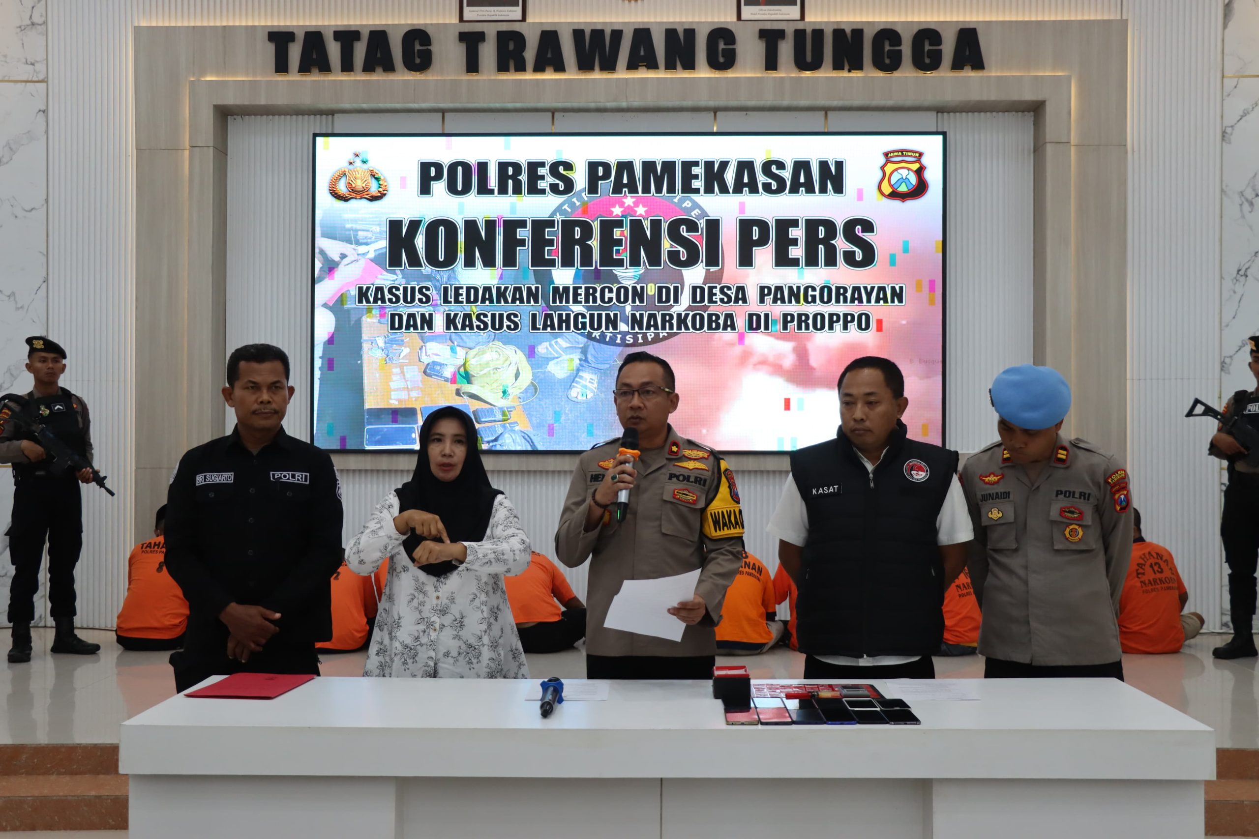 Wakapolres Pamekasan Kompol Hendry Soelistiawan saat konferensi pers di Gedung Tatag Trawang Tungga, mengatakan dari hasil penggeledahan, petugas berhasil mengamankan 3 (tiga) tersangka penyalahgunaan narkoba jenis sabu.