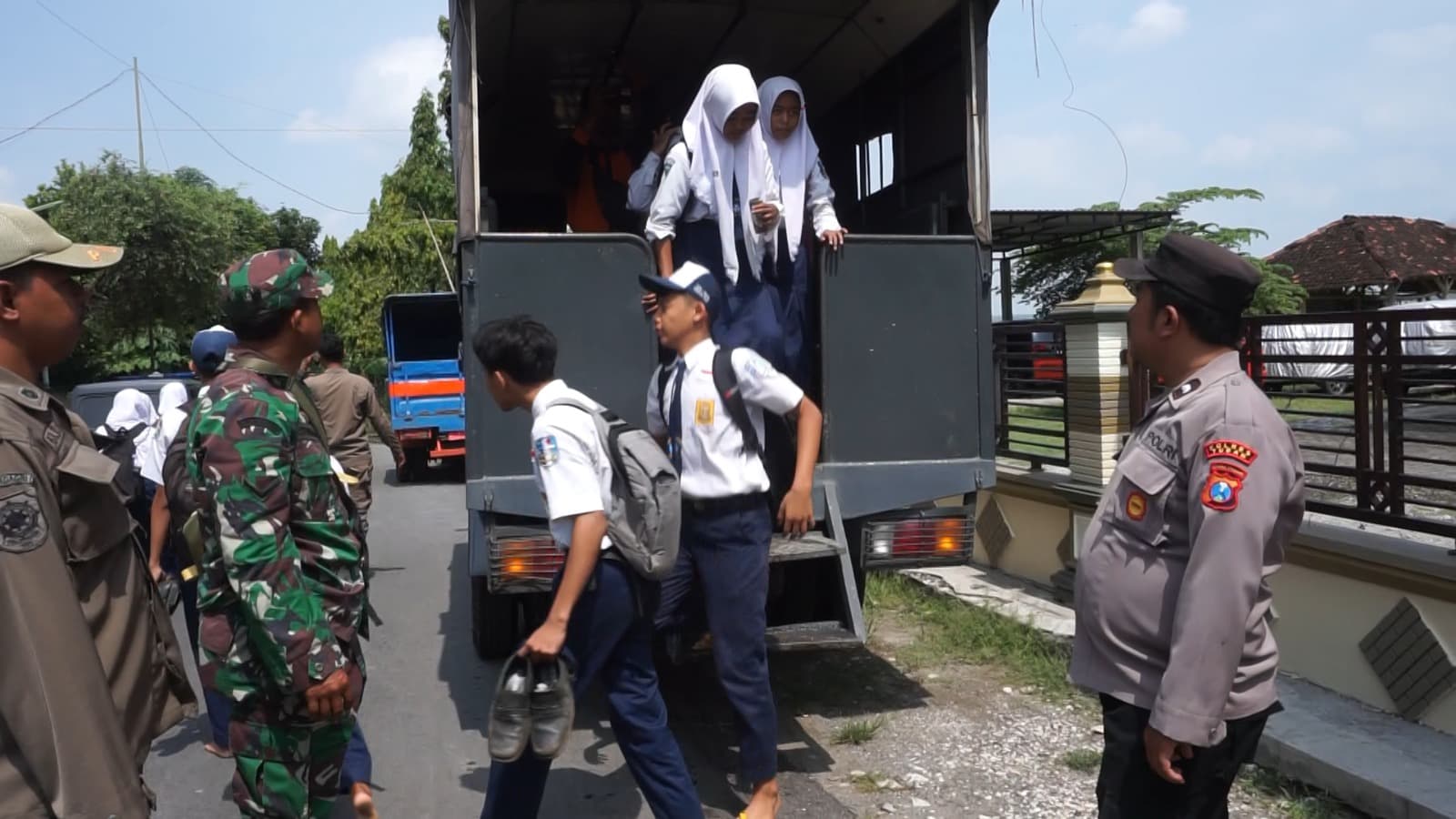 Sejumlah anggota kepolisian terlihat membantu anak-anak menyeberangi genangan air dengan aman, serta membantu masyarakat yang kesulitan melewati jalan yang tergenang cukup dalam dengan diangkut menggunakan truk.